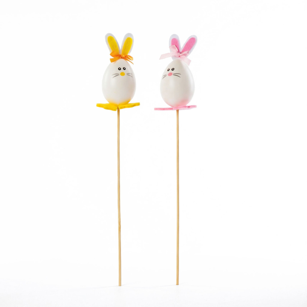 Tegye ünnepivé otthonát ezzel a bájos húsvéti dekorációval! A szett 2 darab, 33 cm hosszú pálcikás tojásfigurát tartalmaz, amelyek aranyos nyusziként vannak díszítve. A fehér tojás alakú testeket színes filcfülek (sárga és rózsaszín) és vidám masnik teszik különlegessé, így tökéletes kiegészítői lehetnek tavaszi kompozícióknak, virágcsokroknak vagy ünnepi asztaldíszeknek.A dekoráció könnyű, strapabíró anyagból (filc és műanyag) készült, praktikus leszúrható pálcikával, így egyszerűen elhelyezhető vázában, virágcserépben vagy bármilyen kreatív dekorációs összeállításban.