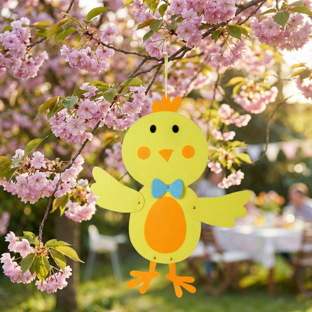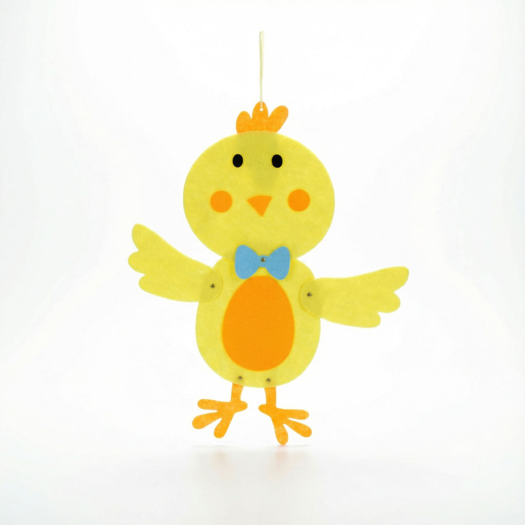 Teremtsen tavaszi hangulatot otthonába ezzel a bájos húsvéti csibével! A filcből készült függő dekoráció élénk sárga és narancssárga színeivel, valamint vidám masnijával minden helyiséget feldob. Könnyedén felakasztható ajtóra, falra, ablakra vagy akár gyerekszobába is. Kiváló választás húsvéti díszítéshez, ünnepi kompozíciókhoz vagy ajándék kiegészítőjeként.