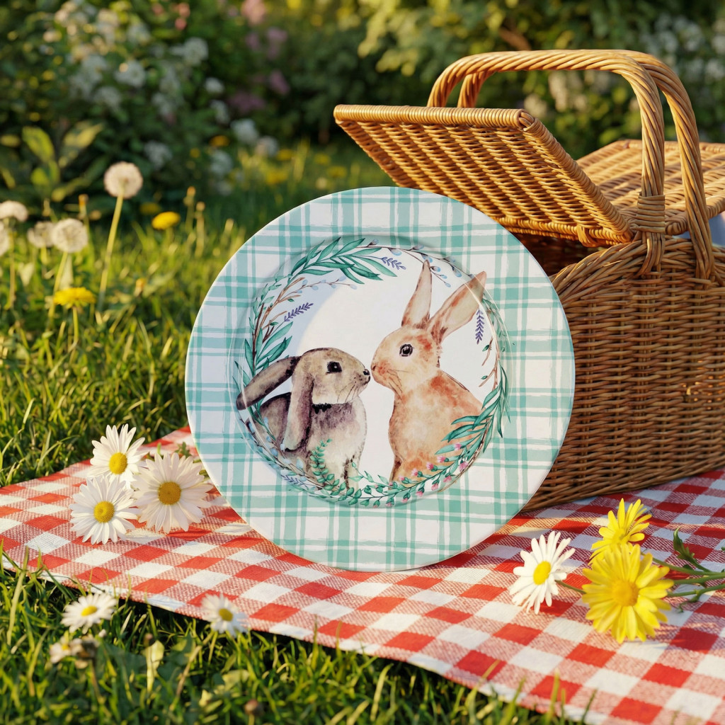 Tegye különlegessé ünnepi asztalát ezzel a bájos, nyuszis mintával díszített húsvéti tányérral! A fémből készült dekor tányér elegáns kiegészítője lehet a húsvéti terítéknek. A kockás minta és a középen elhelyezkedő, szeretetre méltó nyuszis grafika tavaszi, ünnepi hangulatot varázsol otthonába. Ideális választás asztali dekorációként, ünnepi kompozíciókhoz, de ajándék kiegészítőjeként is megállja a helyét.