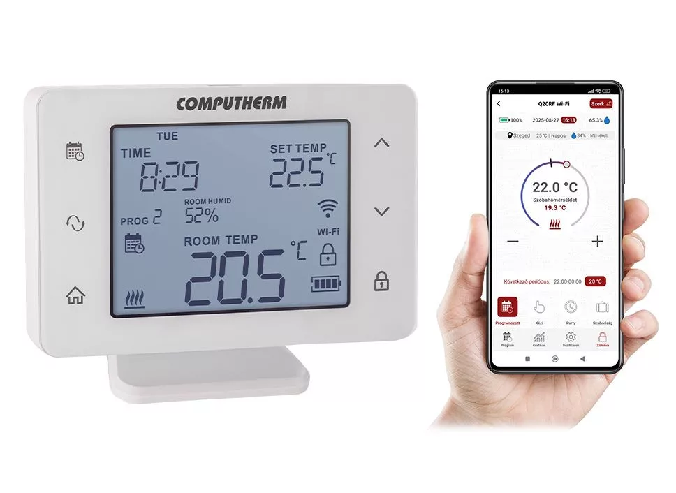 A Q20RF Wi-Fi típusú kapcsoló üzemű szobatermosztát a Magyarországon forgalomban lévő kazánok, klímaberendezések, párásító és párátlanító berendezések túlnyomó többségének szabályozására alkalmas. Egyszerűen csatlakoztatható bármely, kétvezetékes szobatermosztát csatlakozási ponttal rendelkező gázkazánhoz, klímaberendezéshez, párásító és párátlanító berendezéshez, valamint egyéb elektromos készülékhez függetlenül attól, hogy az 24 V-os vagy 230 V-os vezérlőáramkörrel rendelkezik. A készülék egyéni igény szerint beprogramozható úgy, hogy a fűtési/hűtési vagy a párásító/párátlanító rendszer az Ön által kívánt időpontokban tetszés szerinti hőfokra fűtse/hűtse vagy páratartalomra párásítsa/párátlanítsa lakását vagy irodáját, és a komfort biztosítása mellett hozzájáruljon az energiaköltségek csökkentéséhez. A készülék interneten keresztül és az érintőgombos kezelőfelületen is egyszerűen vezérelhető, annak működési állapota folyamatosan ellenőrizhető.