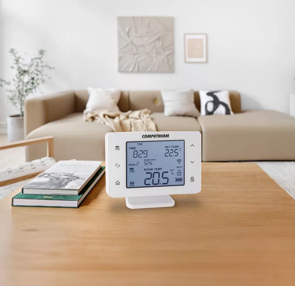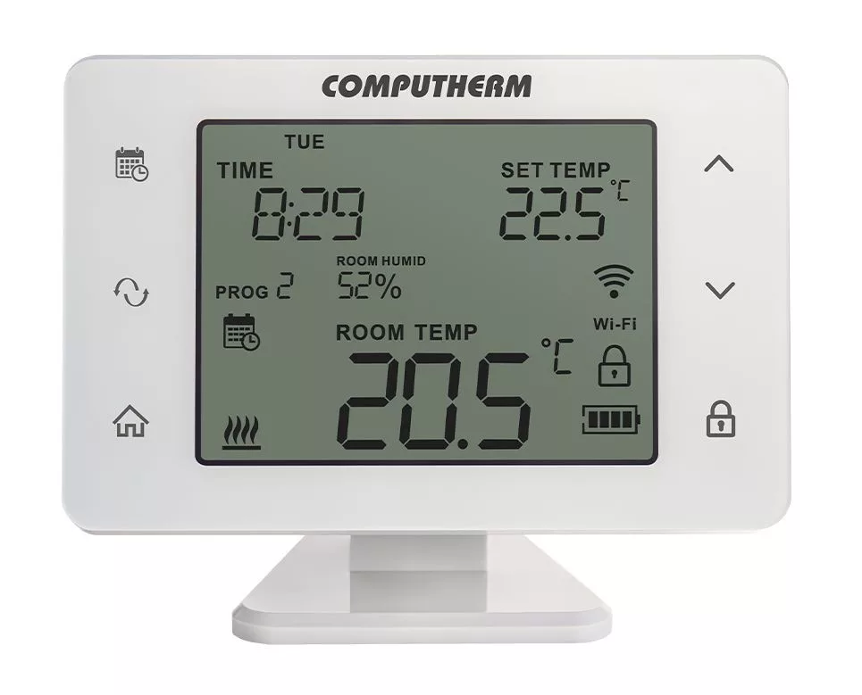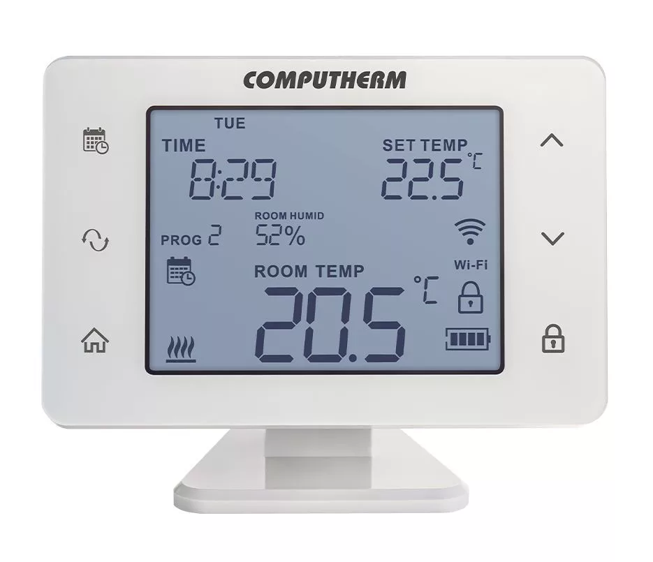 A Q20RF Wi-Fi akkumulátoros, vezeték nélküli termosztát segítségével a hét minden napjára külön-külön hőmérsékletprogram készíthető, napi 10+1 kapcsolással. A kézi és programozott üzemmódok mellett 3 különböző lehetőség van a program szerinti hőmérséklet időleges módosítására. Ezen kívül a termosztát lehetőséget biztosít a kapcsolási érzékenység megválasztására, a hőérzékelő és páratartalom-érzékelő kalibrálására, szivattyúvédő funkció aktiválására, a hűtés, fűtés, párásítás és párátlanítás üzemmódok közti egyszerű váltásra, valamint a kezelőgombok lezárására is. A páratartalom-érzékelőnek köszönhetően beállítható egy maximális páratartalom limit, ami felett hűtés üzemmódban a kimenetet letiltja a felülethűtési rendszer páralecsapódás elleni védelme érdekében. A termosztát nagy kijelzője és érintőgombjai aktiválható háttérvilágítással vannak ellátva, amelyek fényereje konfigurálható. Az érintőgombok megérintésének visszaigazolását aktiválható visszajelző hang biztosítja. A termosztát vezeték nélküli kapcsolatban van a vevőegységgel, így a termosztát helye használat közben is tetszőlegesen változtatható. A Wi-Fi kapcsolatnak köszönhetően lakásának, házának vagy üdülőjének a fűtése bármikor és bárhonnan vezérelhetővé válik.